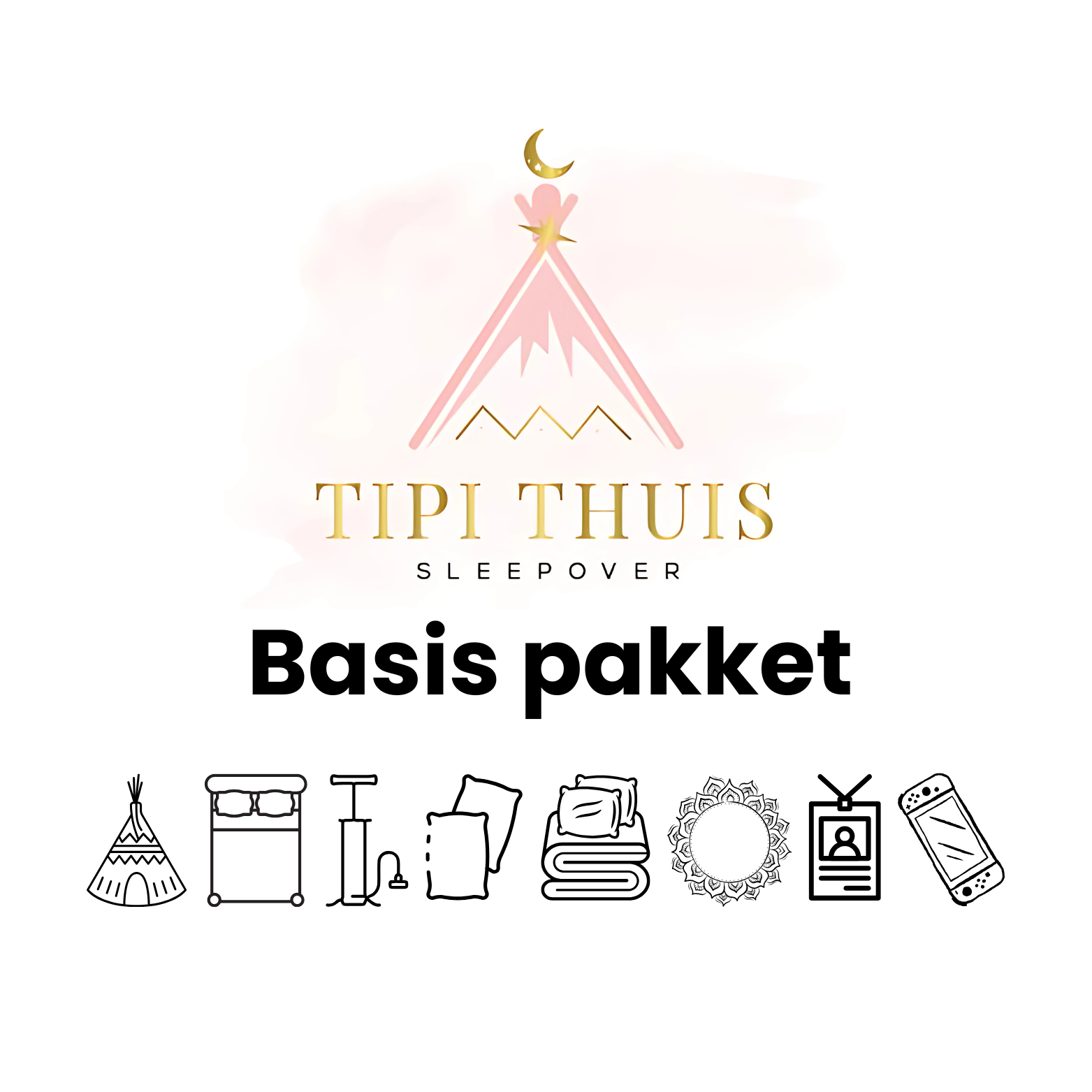 Het Basis Pakket bevat een tipi tent, luchtbed met pomp, kussen en dekbed met overtrek, bedtafel en decoratie.