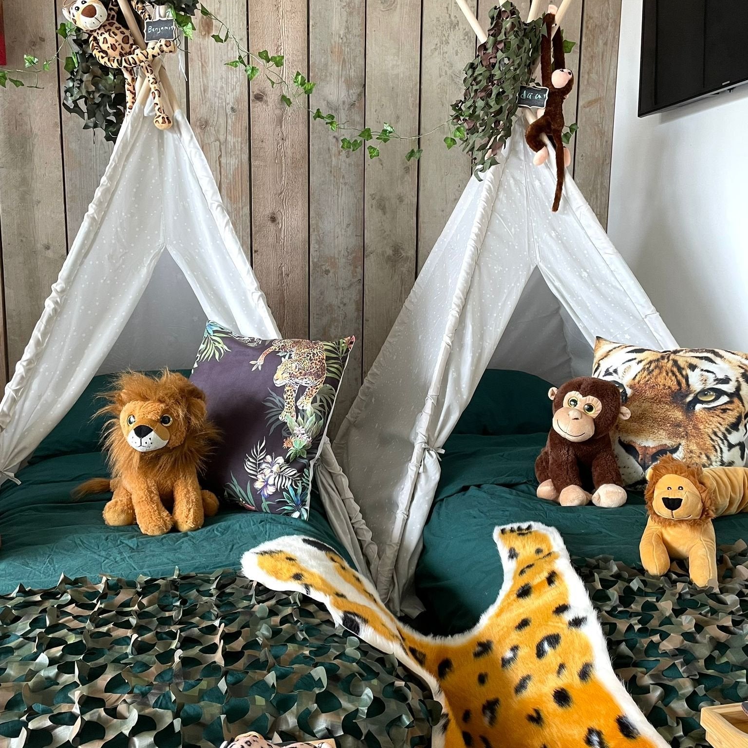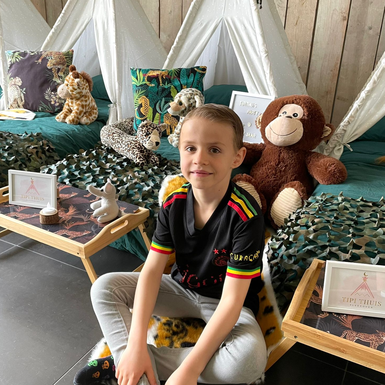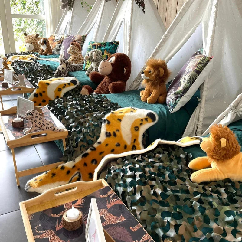 Kampeer in een tipi midden in de jungle en beleef een onvergetelijk feest vol wilde momenten. Maak het extra leuk met jungle-decoraties, comfortabele kussens en een compleet beautymandje. Een avontuur dat je nooit zult vergeten!